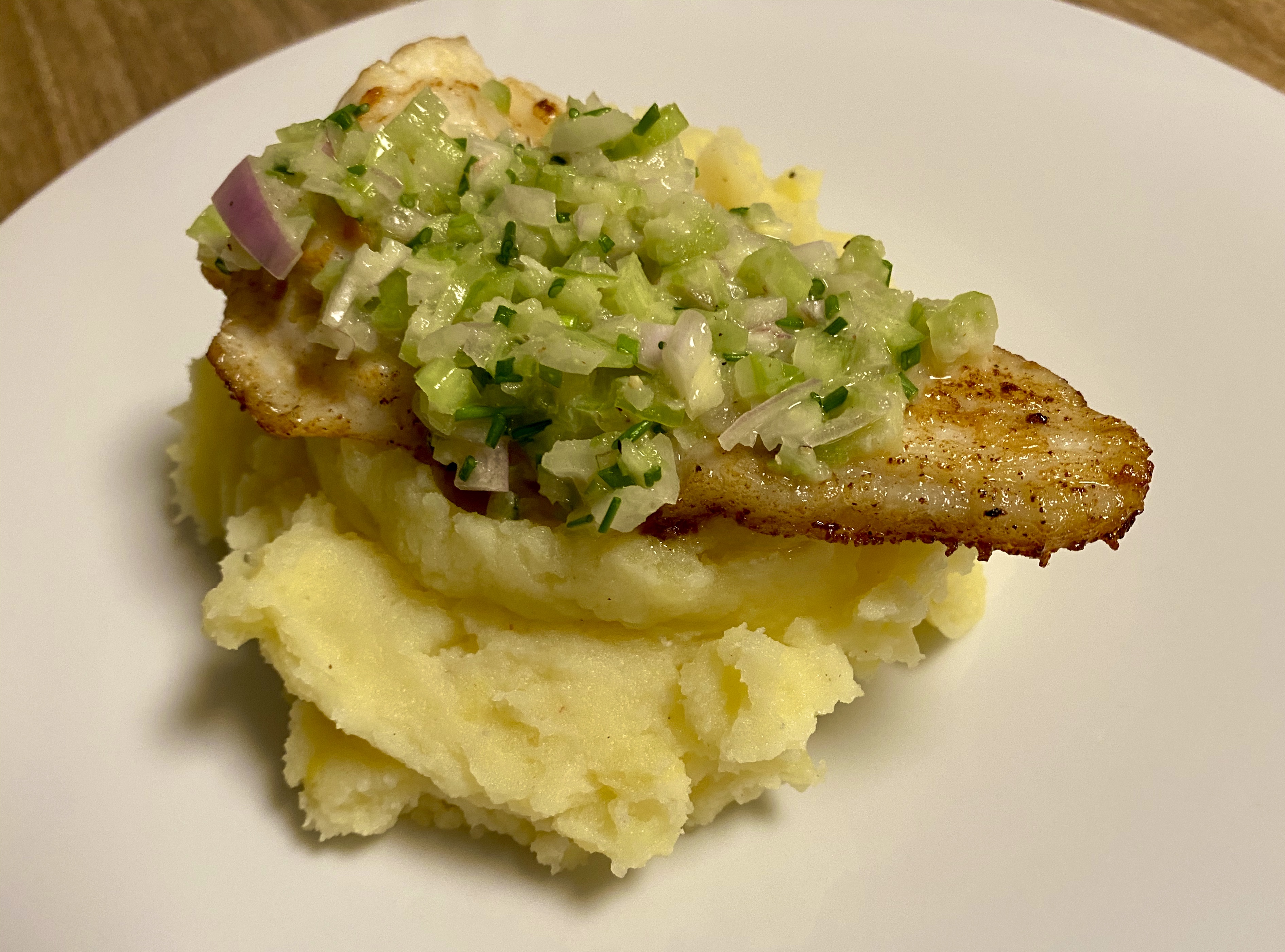 Gebakken grietfilet met smeuĂŻge aardappelpuree en een verassend sausje met groentjes.