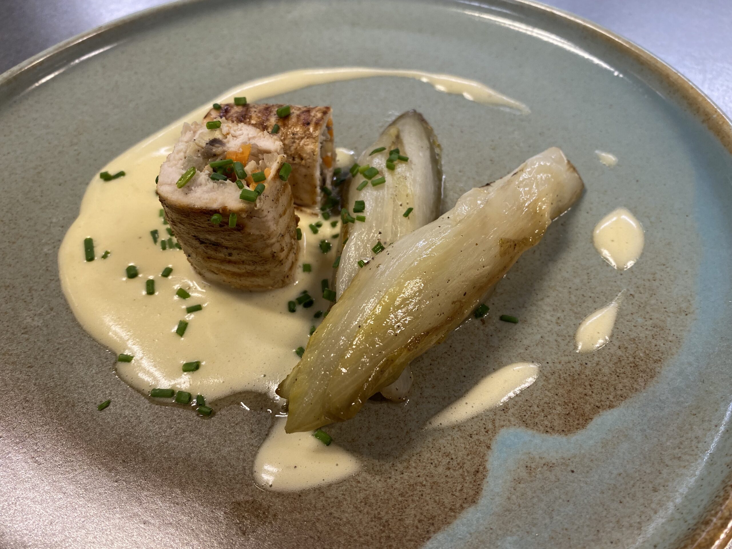 Sappig vacuĂĽm gegaarde kippenfilet gevuld met wortel & duxelle, gekarameliseerd witloof met een verrassend maltaisesausje….